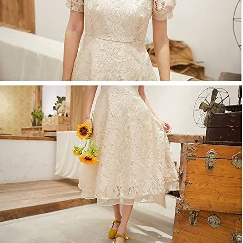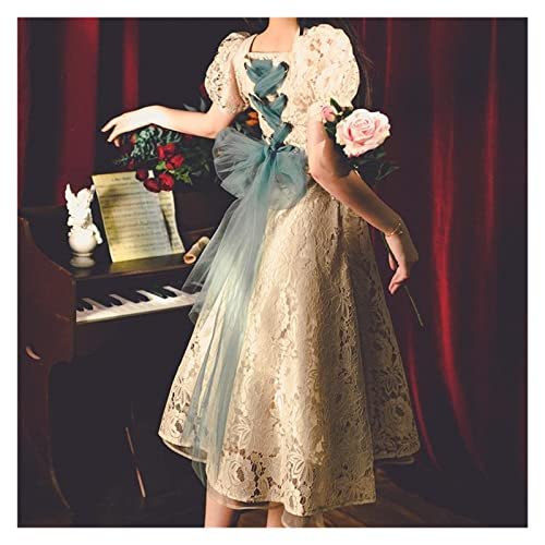 Summer Vintage Dress Bowknot A-Line Lace Dress Female Square Collar One Piece Dress Korean Weddings (Color : A Size : S code) (A M code)