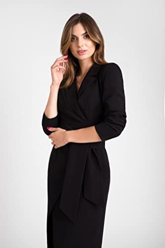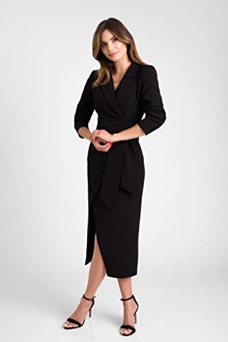 Den marinblå överdelen med dekorativt slag vid halsen i kombination med det anpassade snittet, som sträcker sig över knäet, ser utsökt och mycket elegant ut. Den marinblå klänningen är perfekt för ett affärsevenemang, cocktailkväll eller fotografering.