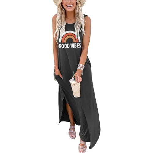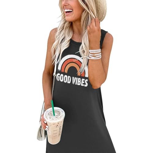 - Snygga sommarklänningar för kvinnor UK – Lägg till en färgstänk till din garderob med denna livliga långa sommarklänning, med ett djärvt regnbågstryck, upplyftande "Good Vibes"-bokstäver och praktiska sidofickor för en trendig men ändå praktisk sommarlook.