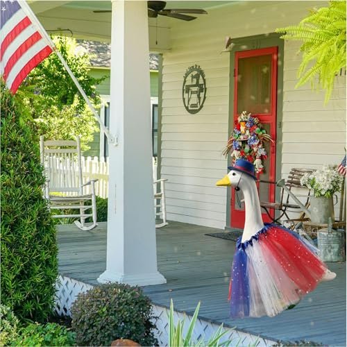 Modiga dekorelement: Den färgstarka designen lyfter ikoniska amerikanska flaggelement och tydliga stjärnmönster. Ger ett smakfullt sätt att visa nationalstolthet genom noggrant utformade kläder till altangäss prydnad utomhus.