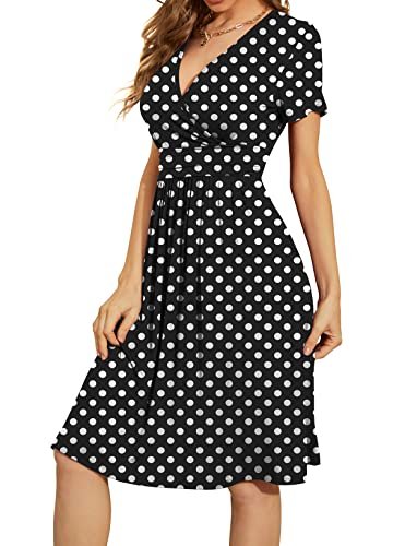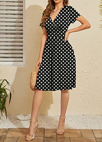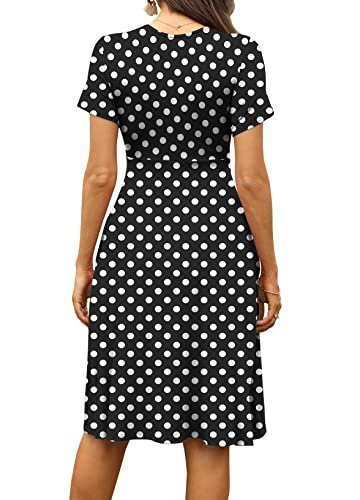 WEACZZY Women Summer Casual Short Sleeve Dresses V-Neck Floral Sundress with Pockets,White Dot Black,XL