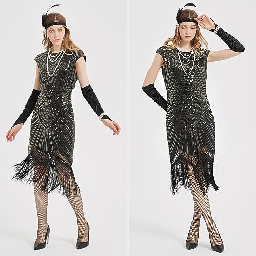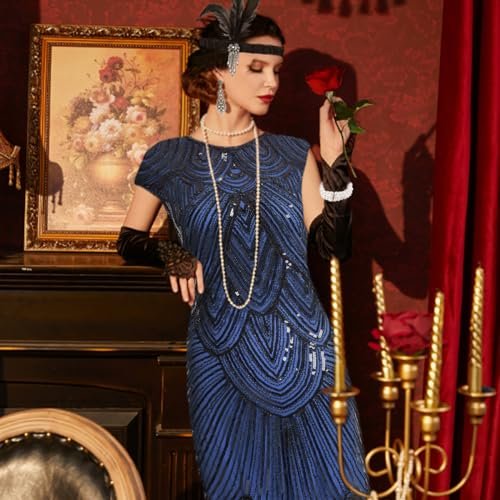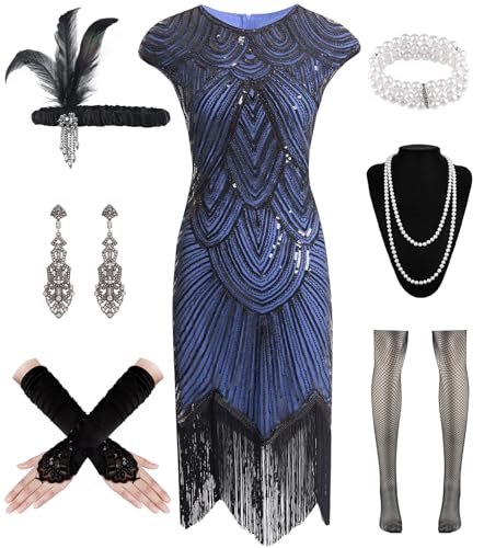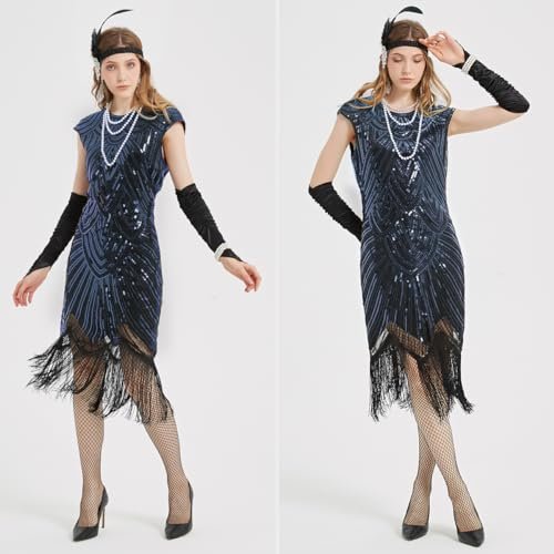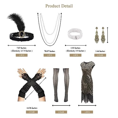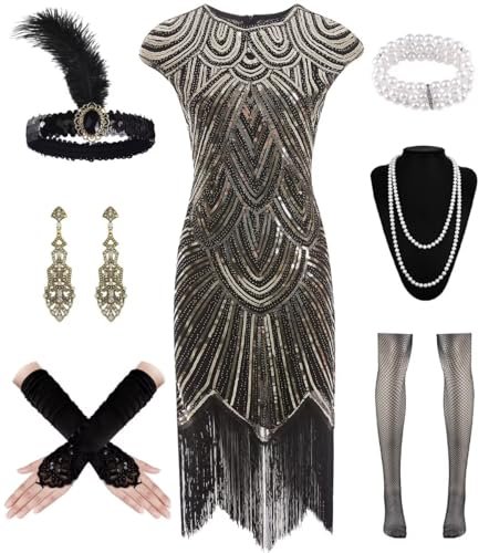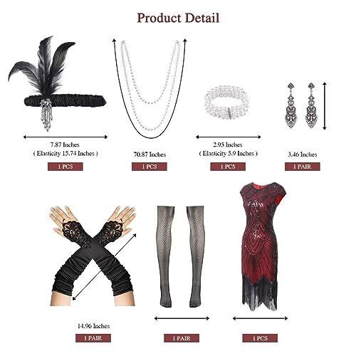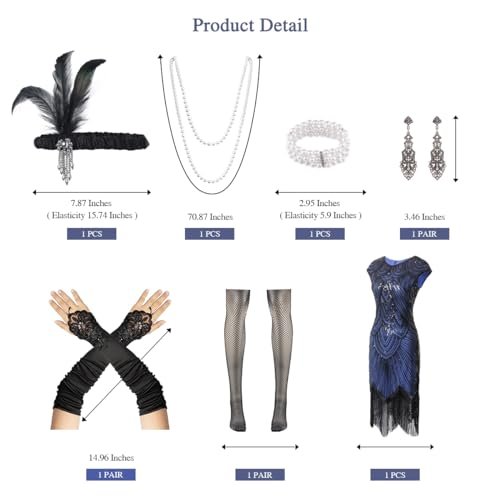 - Klänning 20-talet kostym damer set förpackning: 1 x paljettklänning, 1 x långa satinhandskar, 1 x fjäderpannband, 1 x pärlhalsband, 1 x örhängen, 1 x pärlarmband, 1 x fiskarnätsstrumpor. De vackra och komplexa dekorationerna innehöll också de populära elementen i tiden, såsom tofsar och pärlor, så dessa klänningar inte bara har hög kvalitet utan återspeglar också stilen på 1920-talet.