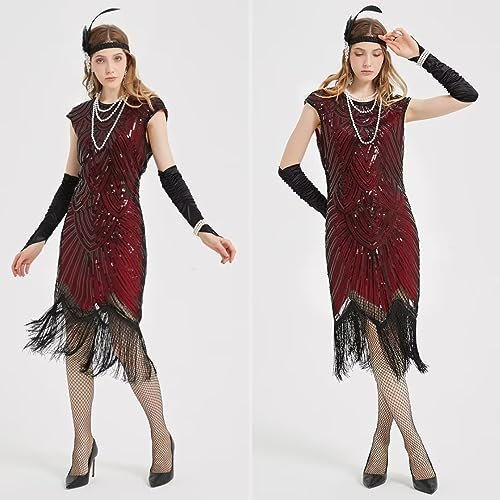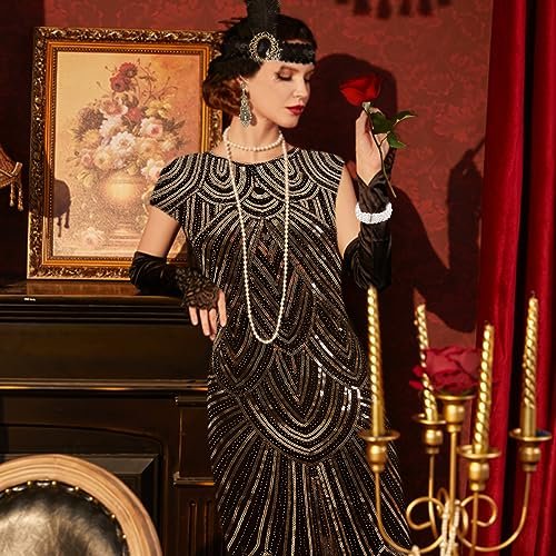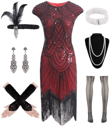 - Retro tillbehör för 20-talet damer: Det moderna pannbandet i retrostil består av fjädrar och gummiband. Pärlarmbanden och pärlkedjorna är förvrängda tillsammans med hela och runda pärlor. Från de glittrande tofsklänningarna till den lyxiga satinduken till eleganta fjädertillbehör kommer du definitivt att gilla hur denna klänning ändrar din stil och ger dig ett oförglömligt utseende. Upplev skönheten och elegansen från 1920-talet!